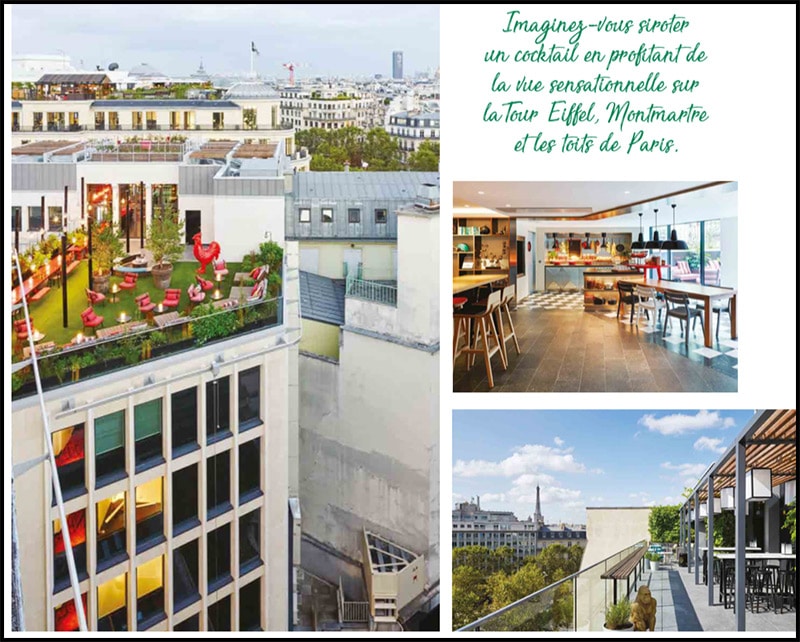 Le soir venu, le rooftop cloudM au 8e étage est the place to be. Guirlandes lumineuses, décor verdoyant et mobilier cosy apportent convivialité et intimité à la terrasse. Imaginez-vous siroter un cocktail en profitant de la vue sensationnelle sur la Tour Eiffel, Montmartre et les toits de Paris. Coup de cœur assuré !