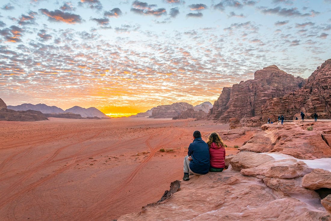 Ce désert aux paysages rocheux s’étend à perte de vue et abrite des trésors naturels animés par des jeux d’ombres qui varient avec le soleil au fil de la journée. Le Wadi Rum accueille les randonneurs pour une expérience de tranquillité de reconnexion avec la nature environnante.