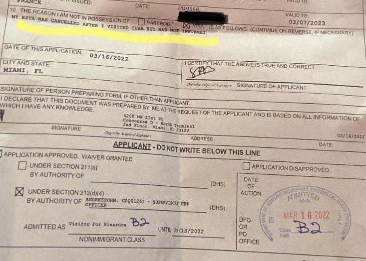 Après avoir fait des pieds et des mains, j’obtiens cependant une autorisation exceptionnelle de sortie du territoire US car je partais à la Dominique pour le travail quelques jours plus tard et que je devais revenir à Miami… Cela a été assez complexe comme processus mais j’ai réussi à revenir à Miami. Au retour, je suis retournée dans la petite salle à nouveau mais ça a été plus rapide vu qu’un officier m’attendait à la sortie de l’avion… Ca fait tout drôle. Un peu comme un prisonnier mais sans menottes. Mon crime ? Etre allée à Cuba. L’officier a été très sympa mais quand même ! Une fois dans la petite salle, on m’a remis un visa tourisme B2 de 6 mois. Il y est écrit noir sur blanc sur le document que j’ai perdu mon ESTA à cause de mon voyage à Cuba car je n’étais pas au courant de cette disposition (voir photo ci-dessous). Ironie du sort, c’est un Américain d’origine cubaine qui s’occupe de moi. Il compatit discrètement et m’avoue qu’il est allé une fois dans le pays de ses parents mais qu’en tant que policier il évite d’y retourner. Il me dit au passage que l’île de Cayo Guillermo, où j’ai séjourné à Cuba est sublime.
