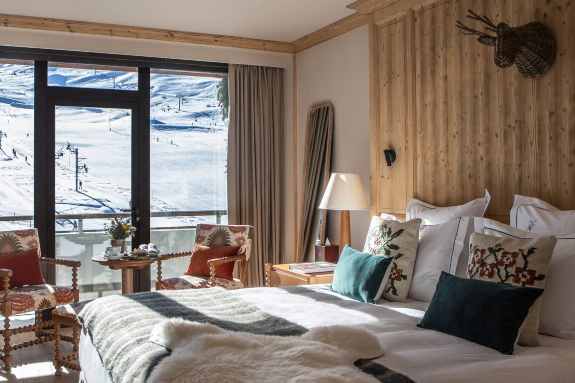 des 3 Vallées. Et si vous ne skiez pas, une avalanche de douceurs et de voluptés de toutes sortes vous attend sur place. Bar (à champagne Veuve Clicquot), terrasse panoramique plein soleil, carte élaborée par la cheffe Flora Mikula, espace Kids club, Spa Kos Paris, Ski room signée Bernard Orcel… Le tout dans un cadre intégralement modernisé sans perdre un once de cet aspect cocon qui fleure bon les chalets d’antan.