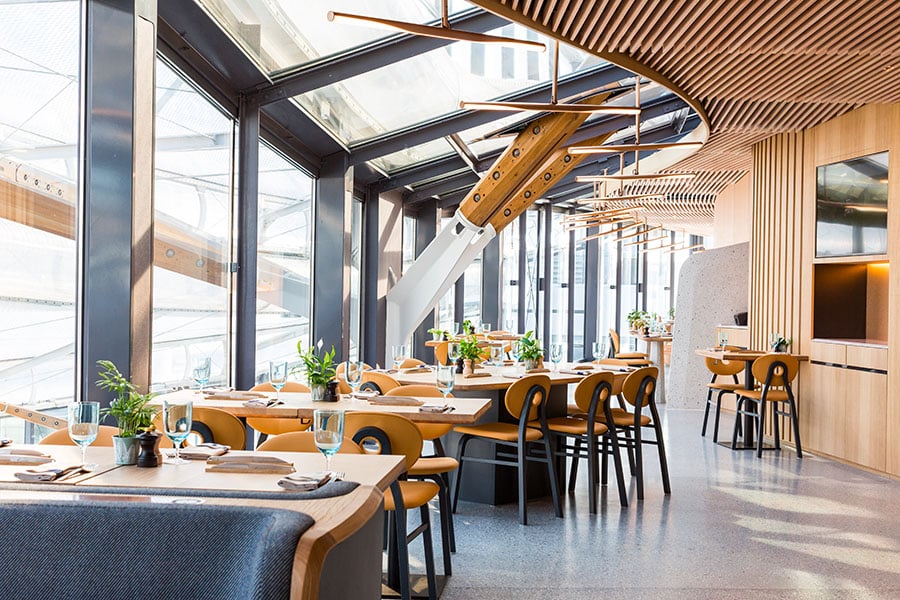 Situé au premier étage de la gare de Rennes, le restaurant Le Paris-Brest by Christian Le Squer offre un cadre lumineux ouvert vers l’extérieur. Au gré des tables, vous profitez ainsi d’une vue sur le ballet régulier des trains, le va-et-vient des voyageurs ou l’architecture singulière de la gare. La décoration est l’œuvre du talentueux duo Patrick Jouin et Sanjit Manku, qui a également designé la salle du Plaza Athénée à Paris. Un superbe bar semi-circulaire vous fait face dès l’entrée, tandis que les deux étages allient la chaleur du bois au style intemporel du terrazo. Mention spéciale pour les tables de deux personnes dont la forme évoque les tablettes des assises dans les trains. À noter que l’acoustique est spécialement étudiée pour ne pas être gênée par les conversations alentour.