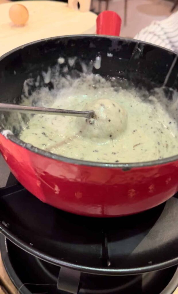 Vous pouvez également succomber au plaisir d’une fondue au chocolat en dessert, ou, encore mieux (!) du mi-cuit au Toblerone.