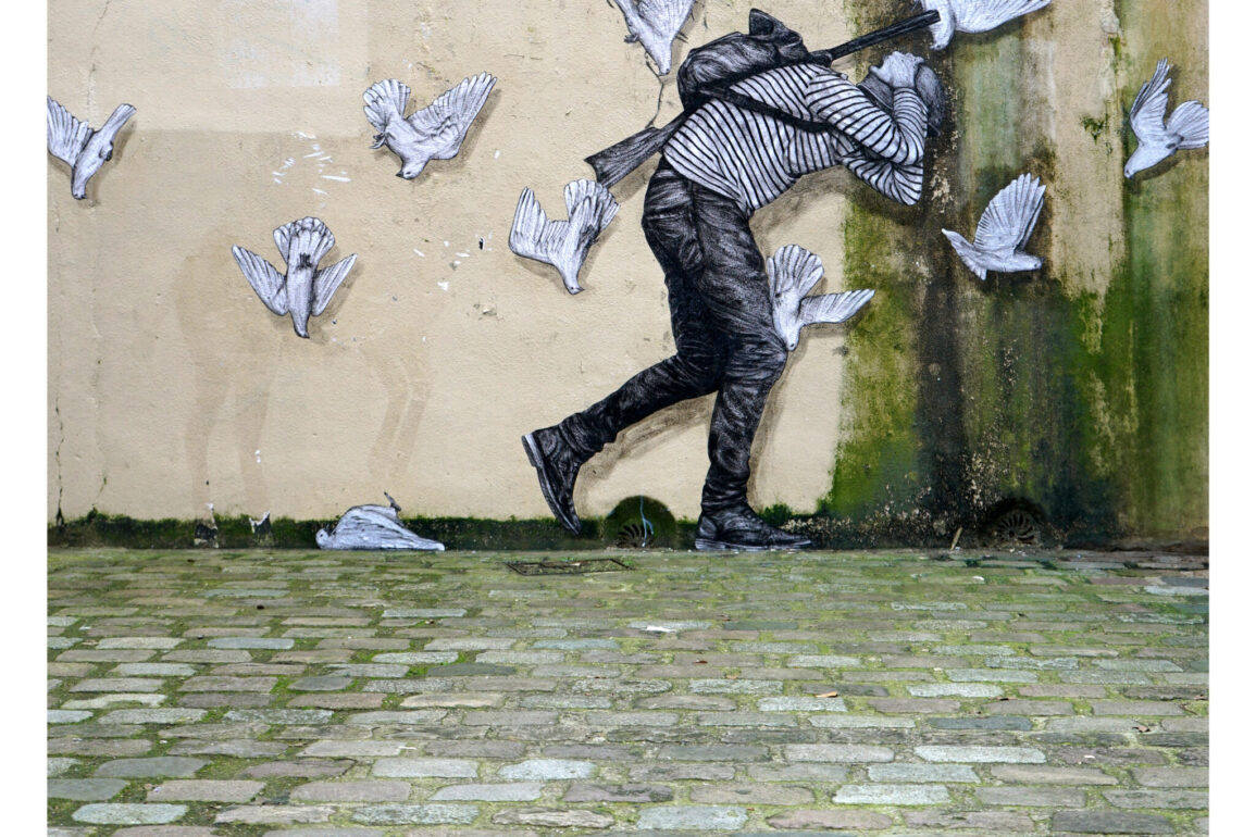 Charles Leval, dit Levalet, est né à Epinal en 1988. Cet artiste français a grandi en Guadeloupe où il découvre l’art urbain.  Son œuvre représente des personnages dessinés à l’encre de Chine, mis en scène dans l’espace public dans un jeu de dialogue visuel et sémantique avec l’environnement présent. Ses personnages, souvent dans des situations frôlant l’absurde, interagissent avec l’architecture.  A l’occasion de cette exposition, on découvrira ses œuvres sur des supports variés tels que des installations, des dessins, des photographies ou des animations. Il proposera également des collages in situ et d’autres pièces qui par leur goût du détail, la volonté de jouer avec le contexte et le détournement d’objets raviront le public. La galerie Joël Knafo est partenaire de cet événement.