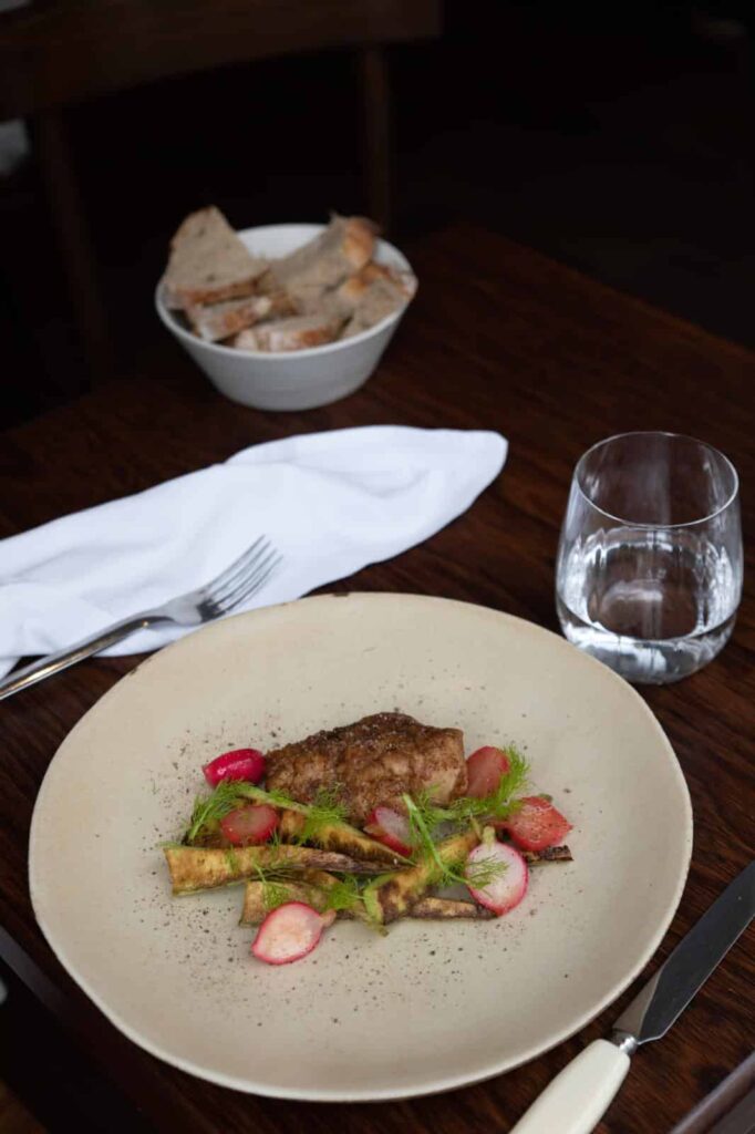 La maison est tenue par Camille, sommelière, et Arthur, chef de cuisine, tous deux passés par le Meurice. Une expérience de palace qui place la barre haut en matière d’exigence. Le sourcing est précis, local et de saison, cela va de soi. Les assiettes sont créatives et modernes.