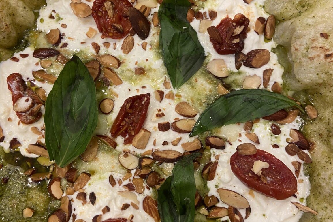 Au menu, on retrouve les antipasti des autres restaurants, où la stracciatella et la burrata ont une place de choix… Il est alors temps de commander une des pizzas napolitaines qui ont fait la renommée de Peppe. On hésite entre la Campione del Mundo (tomates jaunes, jambon cru, provolone, mozzarella di bufala, amandes grillées toastées, confiture de figues BIO) et la Burrata multicolore (Pesto basilic, datterino rouge et jaune confits, stracciatella des Pouilles, amandes grillées). Un choix cornélien. On opte finalement pour la deuxième. Au bout de quelques minutes, la voici sous nos yeux, fumante, à peine sortie du four… C’est une grande pizza ! On se dit qu’on ne pourra jamais finir…