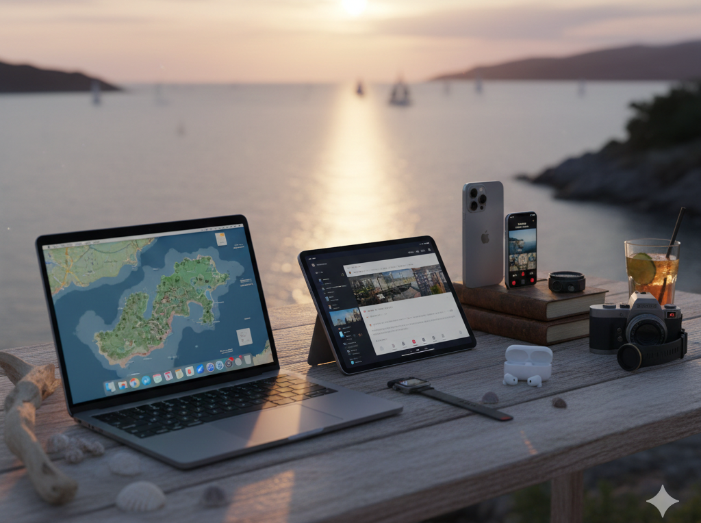 Un iPad dans la poche d’un journaliste, un MacBook Air posé sur une table d’hôtel, un iPhone capturant l’instant. La technologie n’est plus un simple outil, elle devient l’élément indispensable pour raconter le voyage.